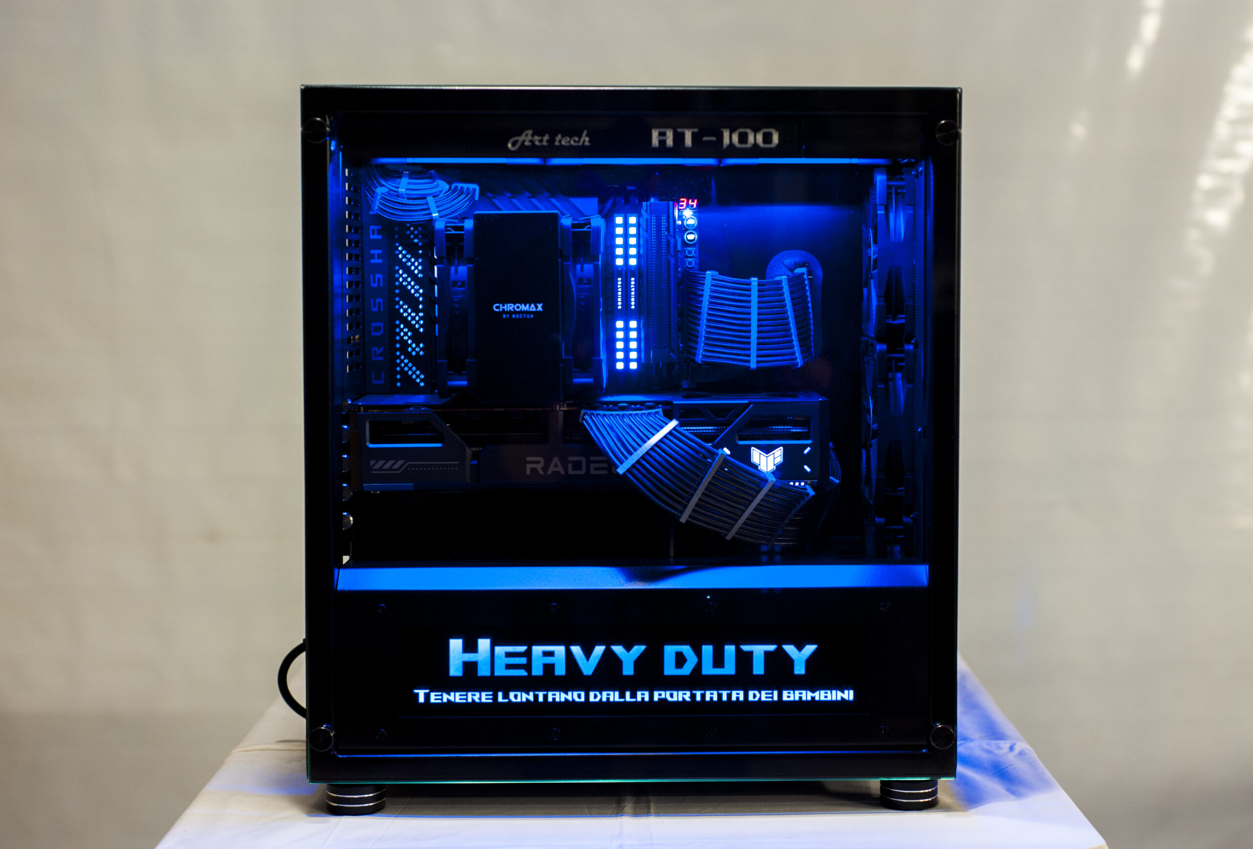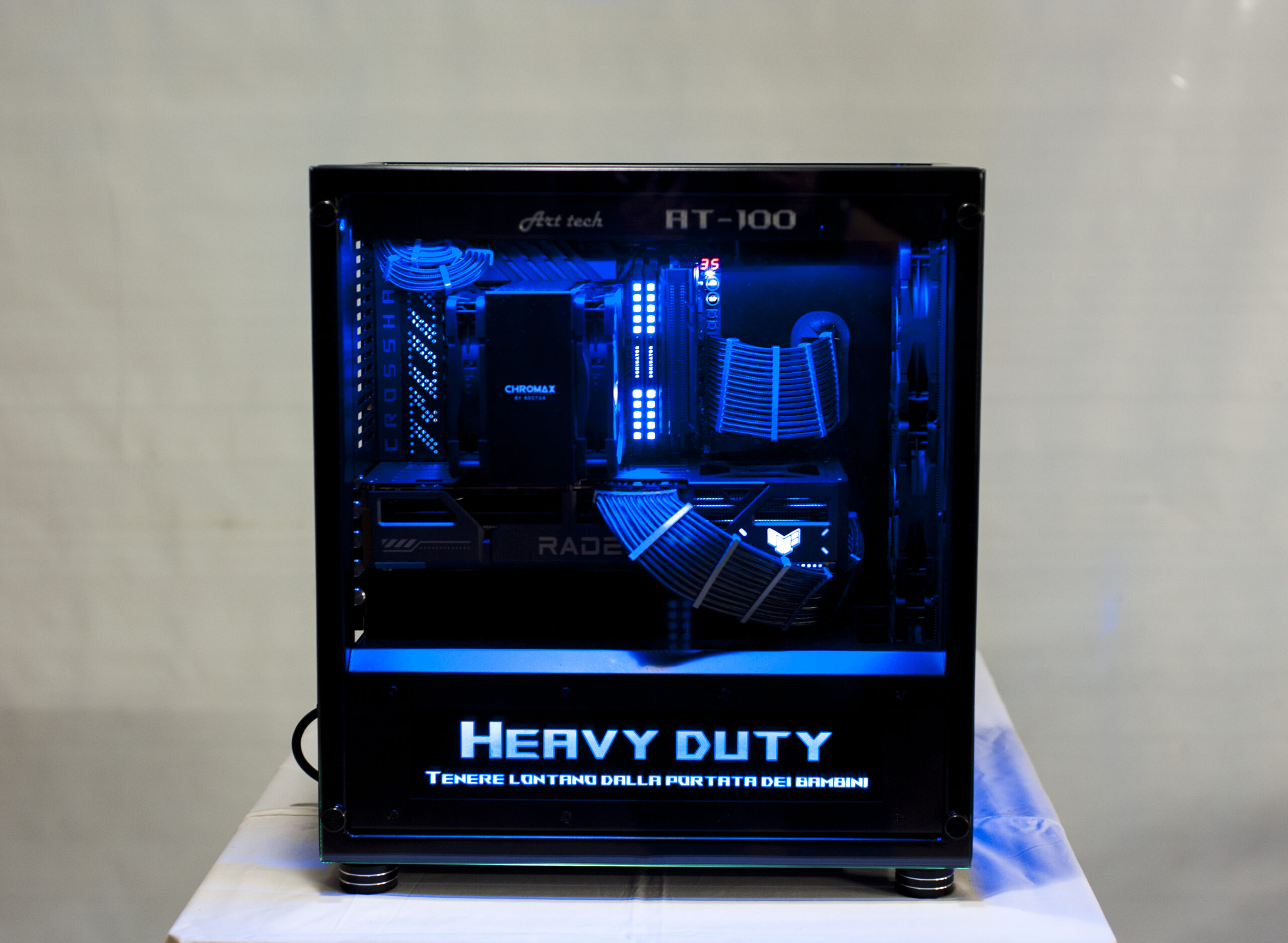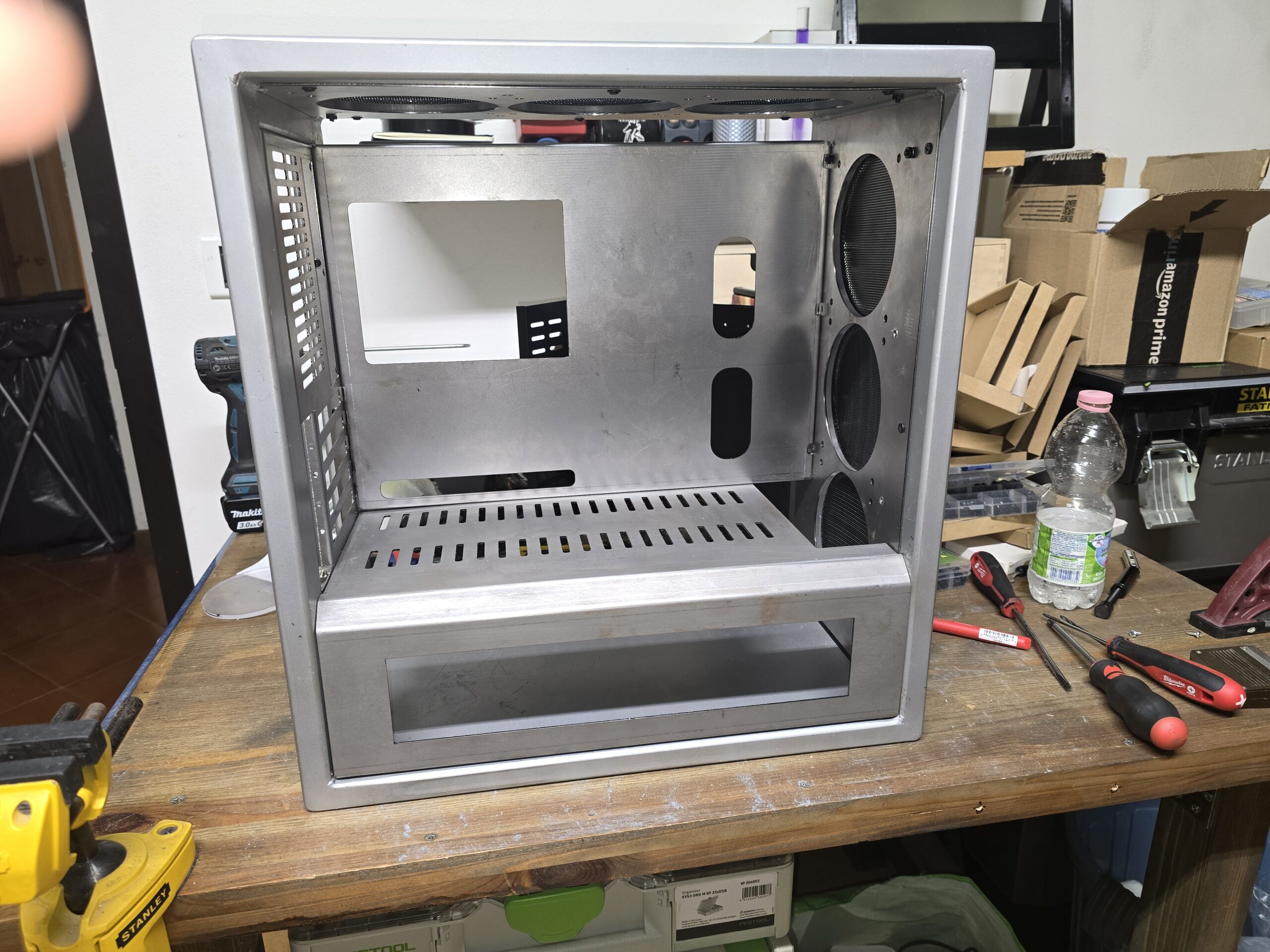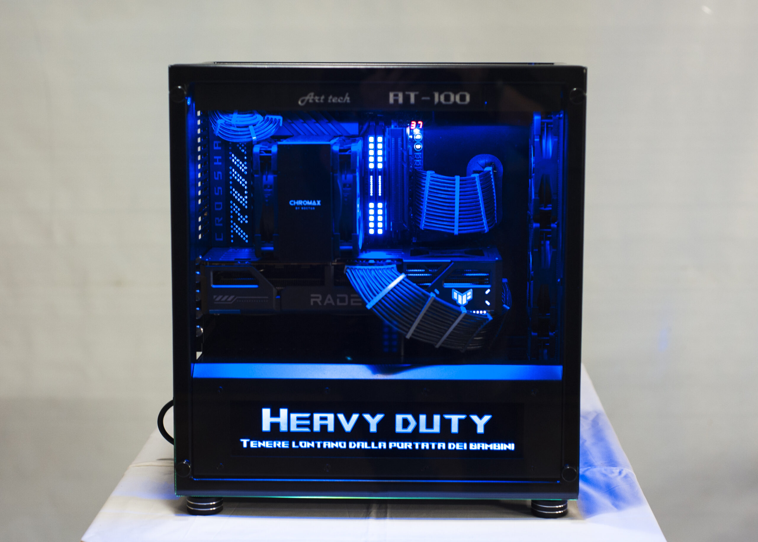 Case interamente costruito su misura per ottenere il massimo con gli spazi interni e l’ingombro richiesti, questa build soddisfa chi cerca il massimo a livello costruttivo ma anche chi cerca un design accattivante. Telaio monoblocco e pannelli interni ed esterni realizzati in acciaio per eliminare ogni vibrazione, non è presente nemmeno un rivetto nell’intera costruzione ed ogni pannello è facilmente removibile con un semplice cacciavite. Il pannello frontale e quello superiore sono magnetici e permettono di cambiare stile senza nemmeno un utensile, sostituendoli con altri in acciaio verniciati di altri colori, in legno di diverse essenze oppure di policarbonato con lavorazione o scritte a piacimento. L’illuminazione è integrata in tutto il case grazie a un sistema custom realizzato “ad-hoc” e infine è possibile mantenere lo stesso telaio, con gli stessi ingombri montando hardware mAtx o Atx tramite la semplice sostituzione di 3 pannelli, con sole 8 viti !!! Vi invitiamo a guardare tutte le foto per capire le enormi possibilità di una build come questa.