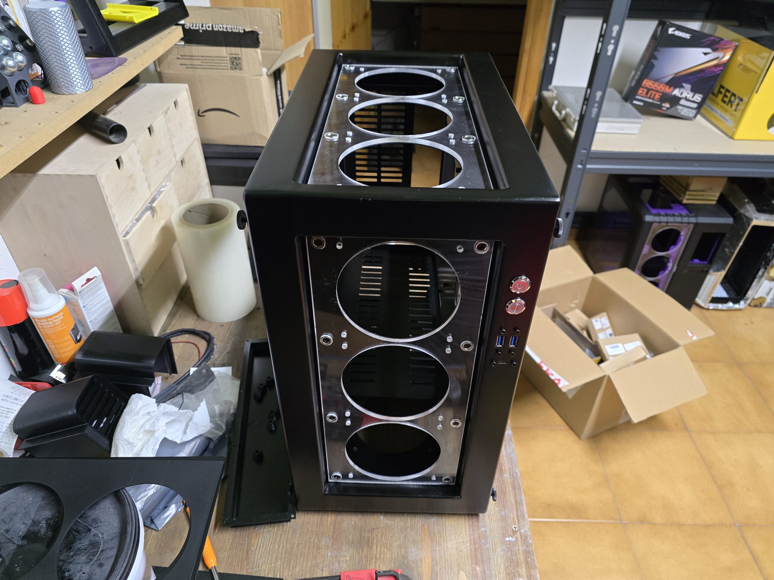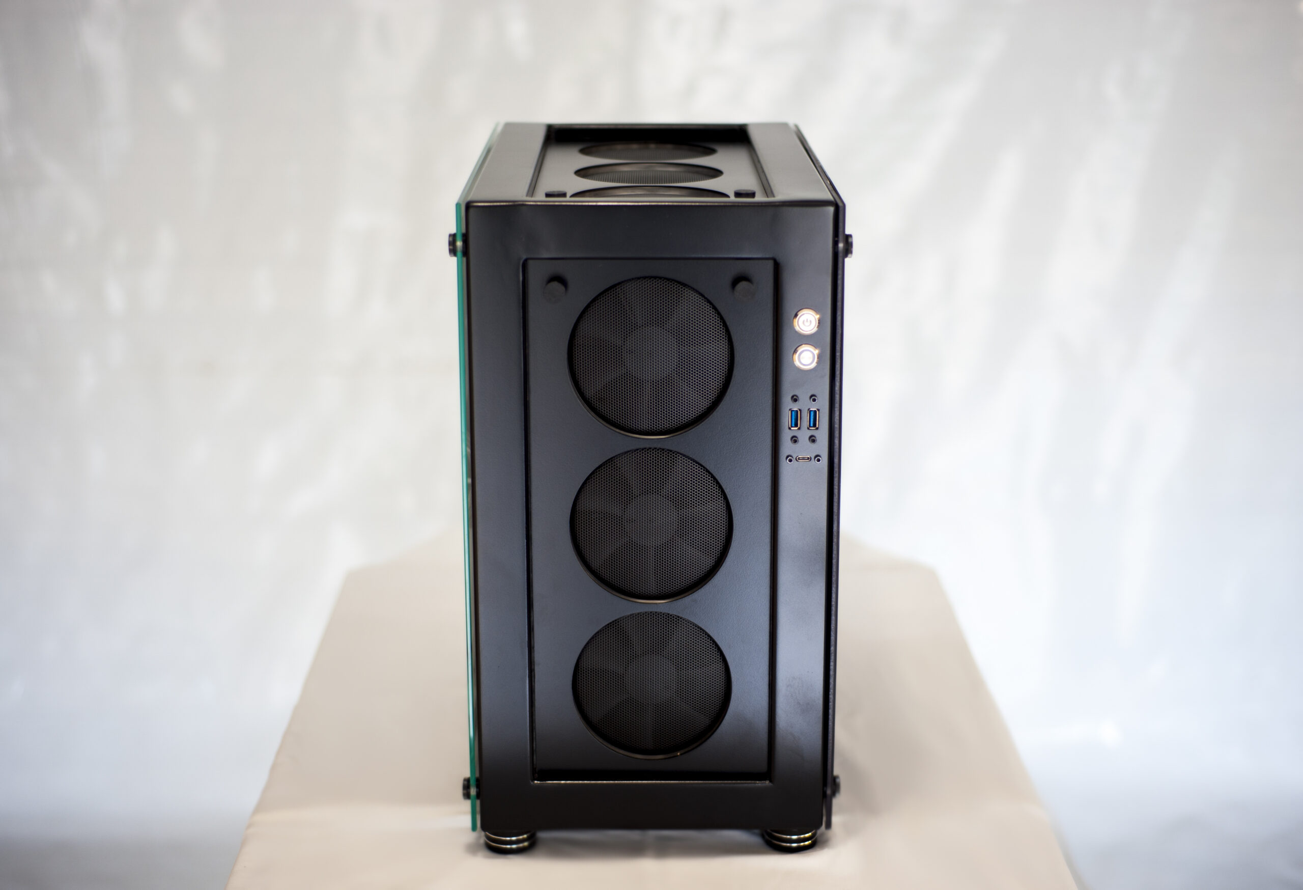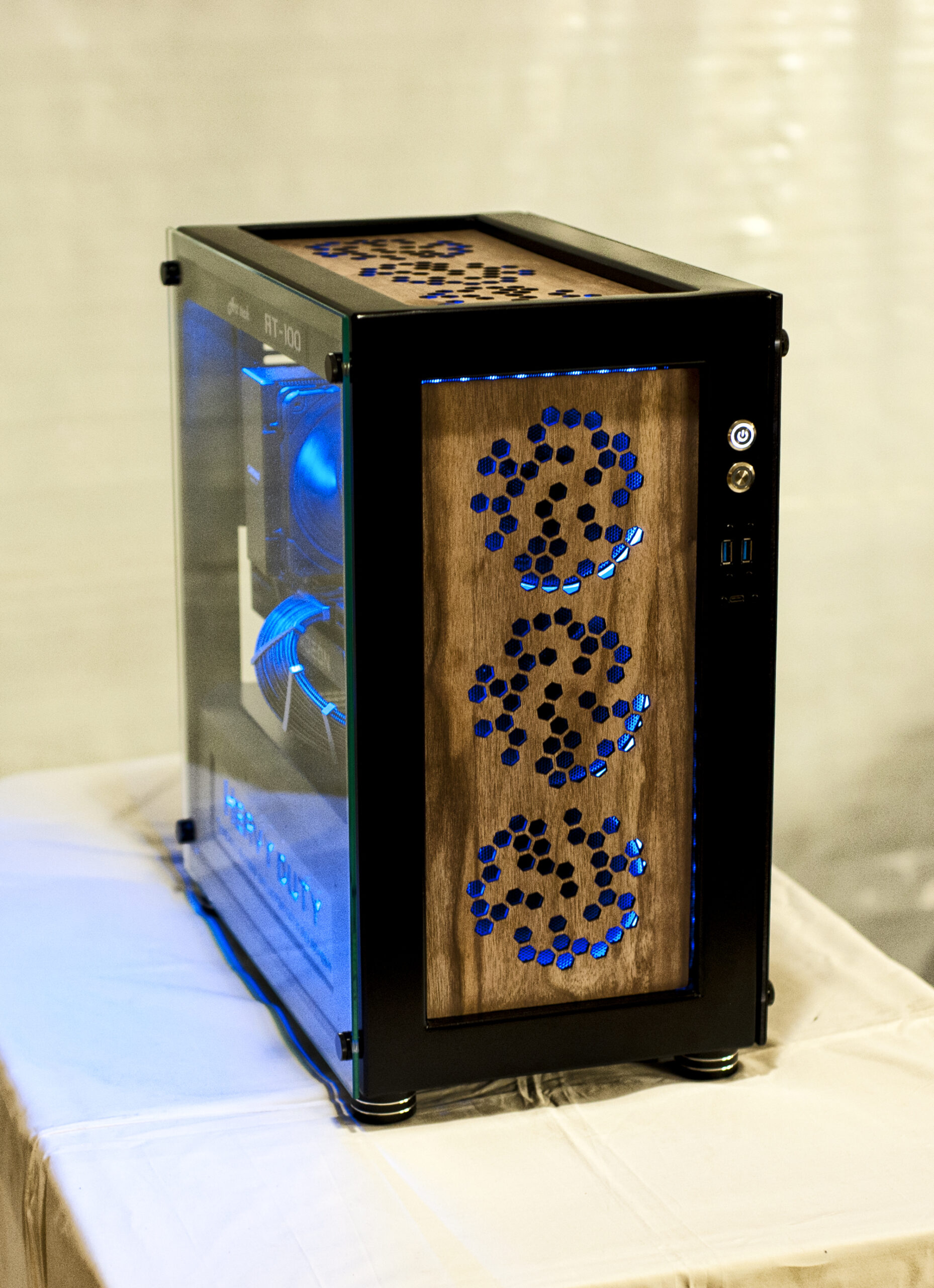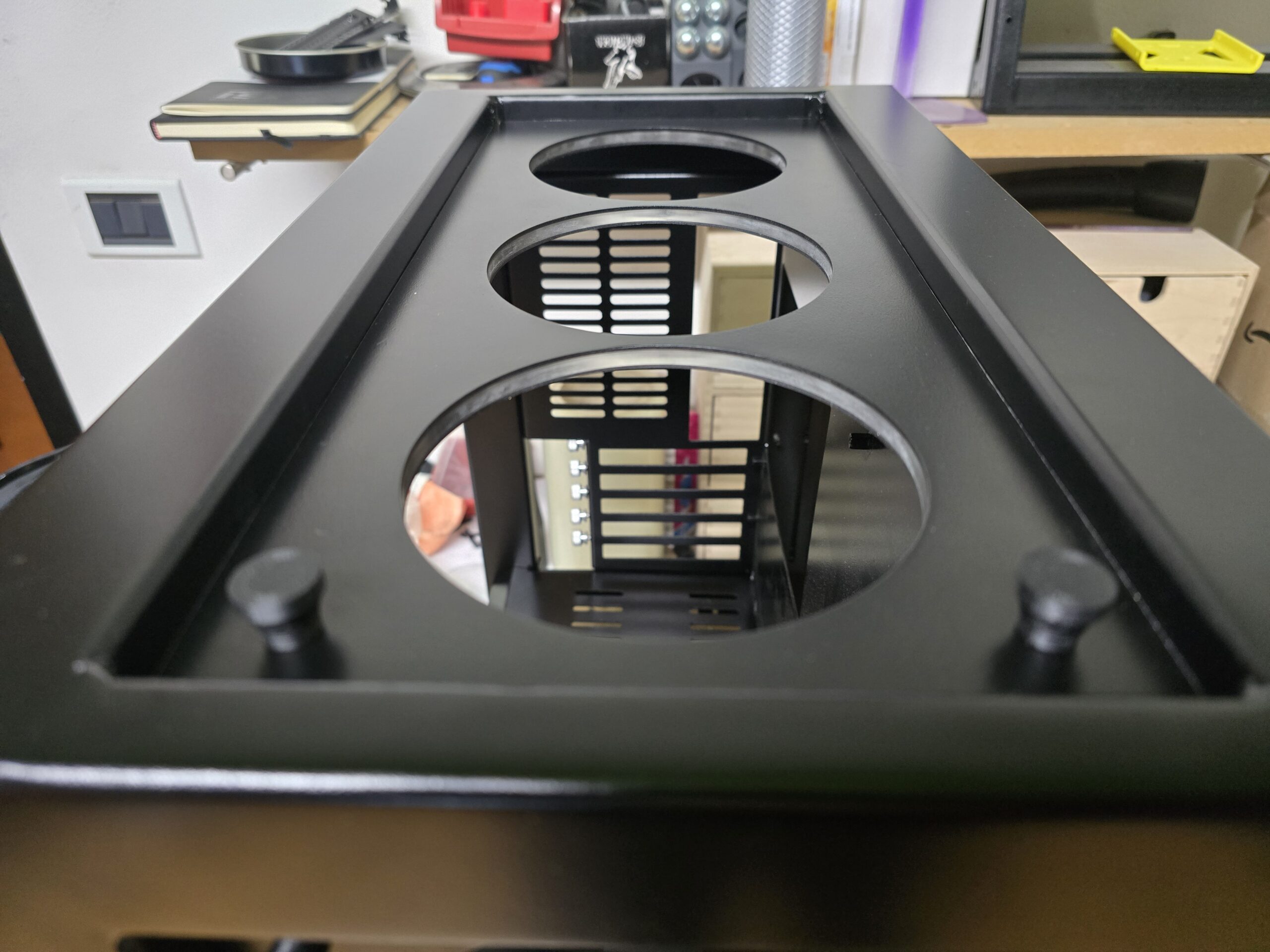 Case interamente costruito su misura per ottenere il massimo con gli spazi interni e l’ingombro richiesti, questa build soddisfa chi cerca il massimo a livello costruttivo ma anche chi cerca un design accattivante. Telaio monoblocco e pannelli interni ed esterni realizzati in acciaio per eliminare ogni vibrazione, non è presente nemmeno un rivetto nell’intera costruzione ed ogni pannello è facilmente removibile con un semplice cacciavite. Il pannello frontale e quello superiore sono magnetici e permettono di cambiare stile senza nemmeno un utensile, sostituendoli con altri in acciaio verniciati di altri colori, in legno di diverse essenze oppure di policarbonato con lavorazione o scritte a piacimento. L’illuminazione è integrata in tutto il case grazie a un sistema custom realizzato “ad-hoc” e infine è possibile mantenere lo stesso telaio, con gli stessi ingombri montando hardware mAtx o Atx tramite la semplice sostituzione di 3 pannelli, con sole 8 viti !!! Vi invitiamo a guardare tutte le foto per capire le enormi possibilità di una build come questa.