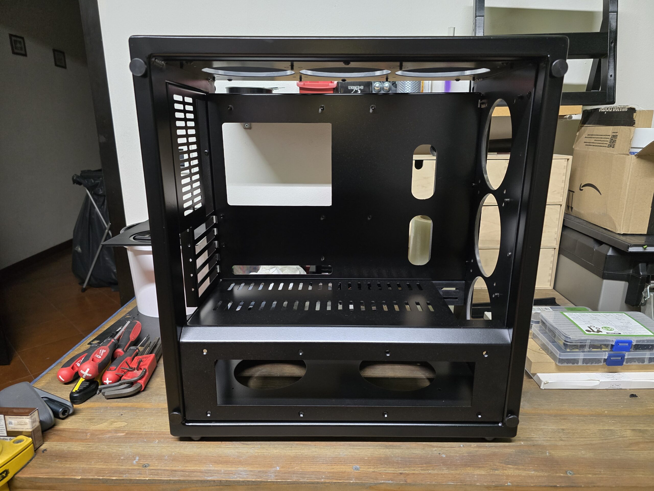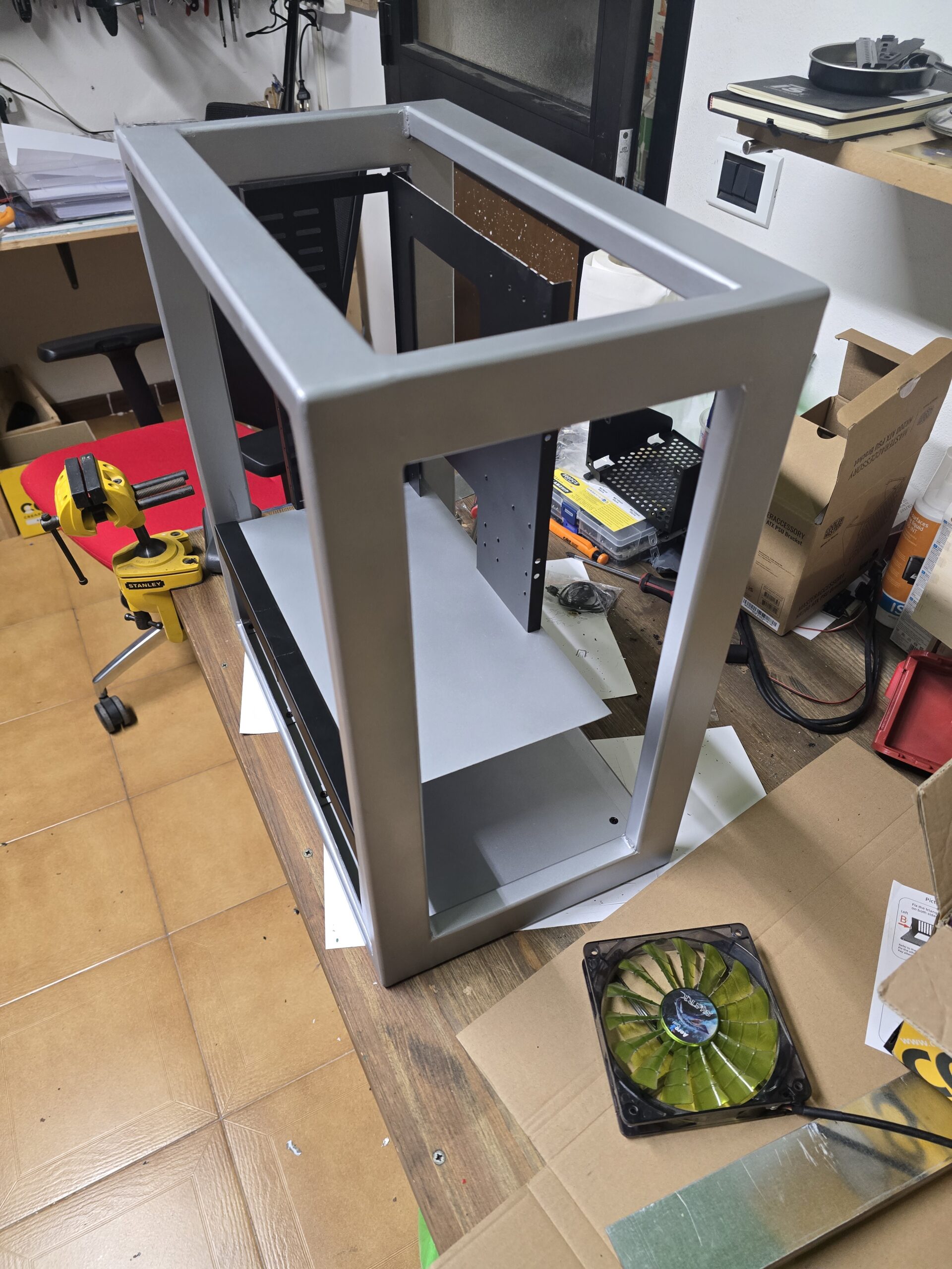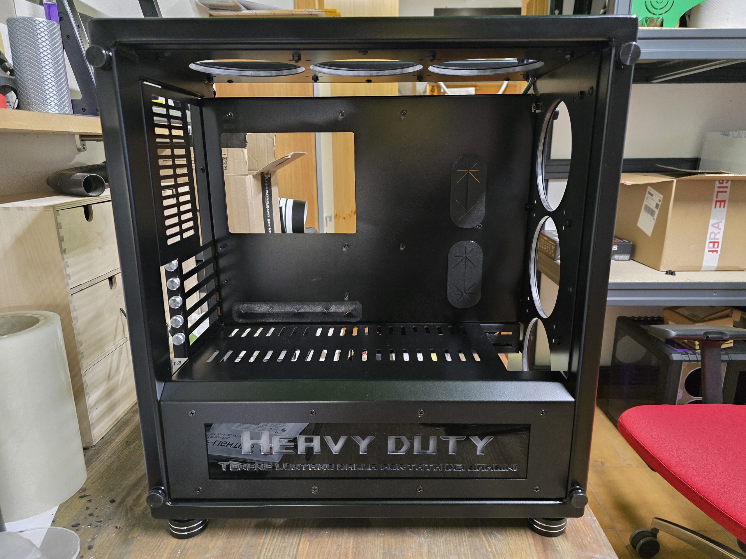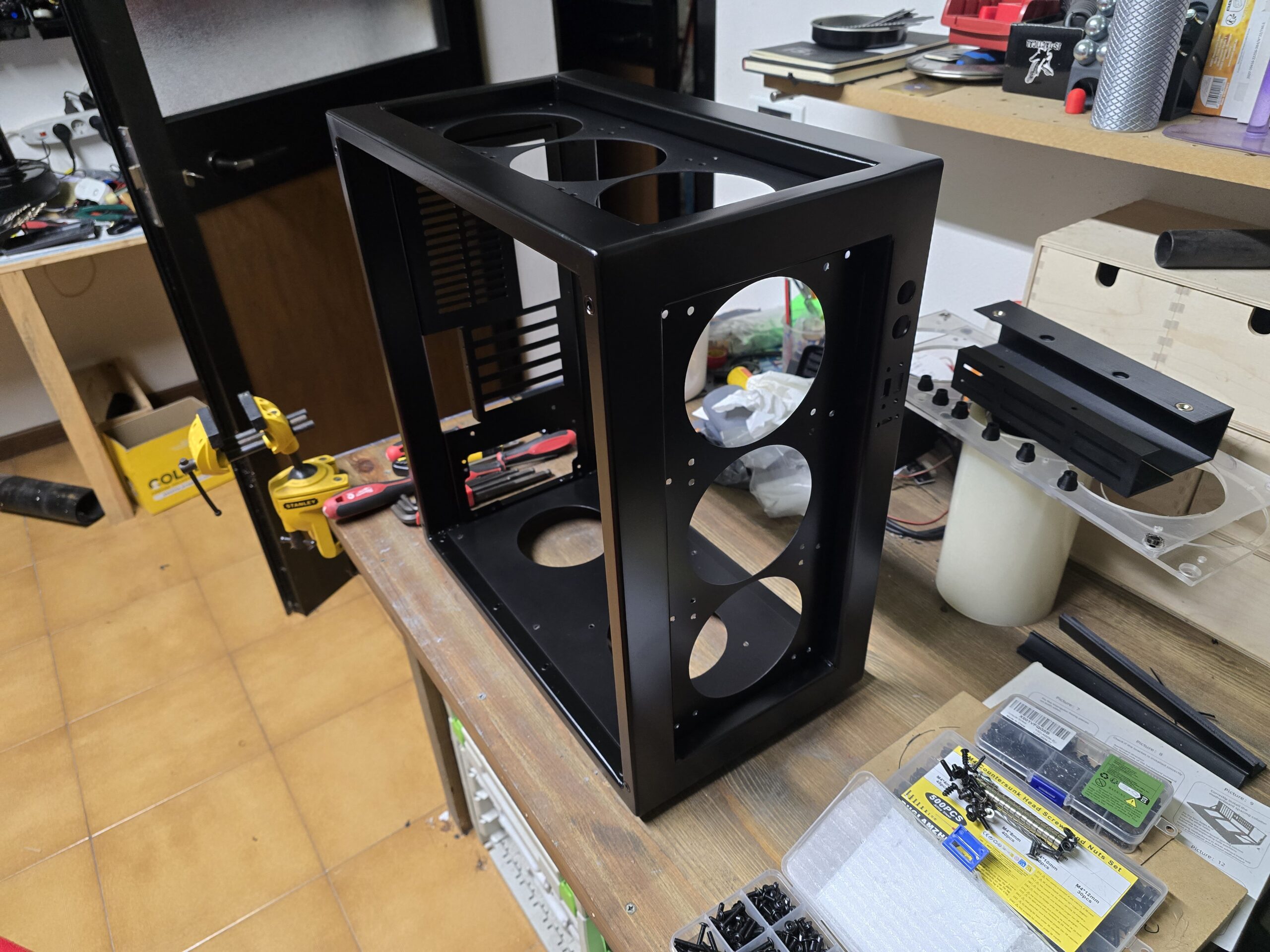 Case interamente costruito su misura per ottenere il massimo con gli spazi interni e l’ingombro richiesti, questa build soddisfa chi cerca il massimo a livello costruttivo ma anche chi cerca un design accattivante. Telaio monoblocco e pannelli interni ed esterni realizzati in acciaio per eliminare ogni vibrazione, non è presente nemmeno un rivetto nell’intera costruzione ed ogni pannello è facilmente removibile con un semplice cacciavite. Il pannello frontale e quello superiore sono magnetici e permettono di cambiare stile senza nemmeno un utensile, sostituendoli con altri in acciaio verniciati di altri colori, in legno di diverse essenze oppure di policarbonato con lavorazione o scritte a piacimento. L’illuminazione è integrata in tutto il case grazie a un sistema custom realizzato “ad-hoc” e infine è possibile mantenere lo stesso telaio, con gli stessi ingombri montando hardware mAtx o Atx tramite la semplice sostituzione di 3 pannelli, con sole 8 viti !!! Vi invitiamo a guardare tutte le foto per capire le enormi possibilità di una build come questa.